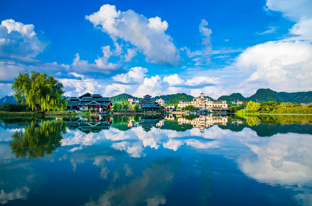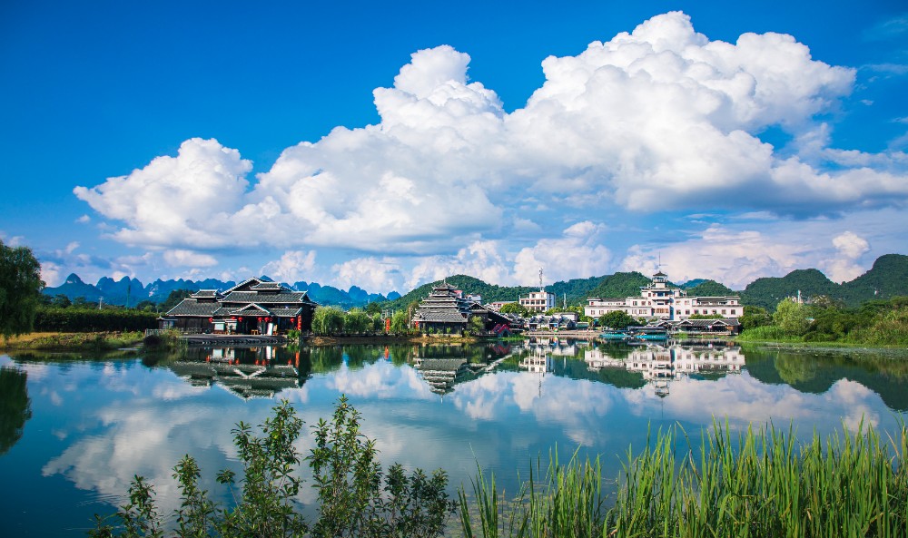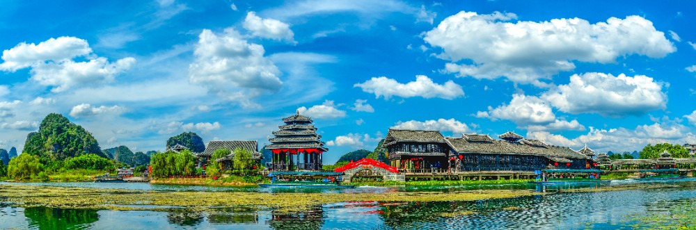 在这“首夏犹清和,芳草亦未歇”的季节,踏进桂林阳朔世外桃源景区,展现在眼前的是一片秀美的山水田园风光。清波荡漾的燕子湖镶嵌在大片的绿野平畴之中,宛如少女的明眸脉脉含情。湖岸边垂柳依依,轻拂水面。一架巨大的水转筒车,吱吱呀呀地摇着岁月,也吟唱着乡村古老的歌谣。放眼望去,远方群山耸翠,村树含烟,阡陌纵横,屋宇错落,宛若陶渊明笔下“芳草鲜美,落英缤纷”,“有良田美池桑竹之属”的桃源画境。