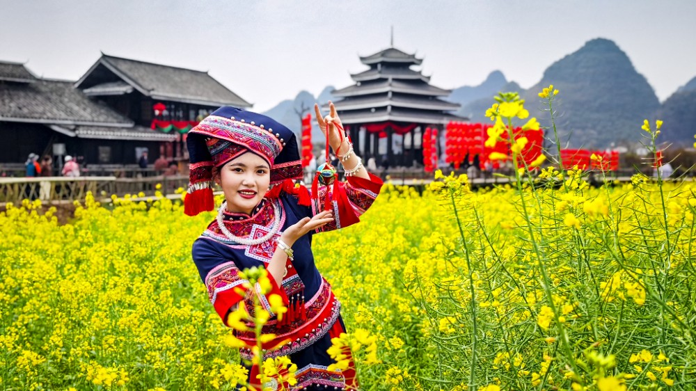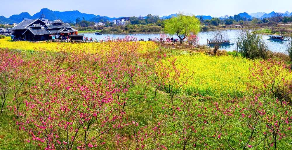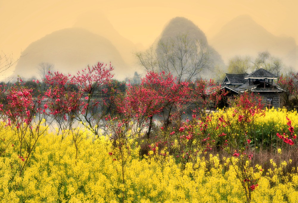 每年三月,桃花怒放,状如云霞,加上金黄色的油茶花和雪白的茹菜花,再镶以紫红色的红花草,一眼望去,桂林阳朔世外桃源景区简直就是一个五彩斑斓的锦绣世界。沿途的田园村舍、古桥溪河、深潭溶洞,加上在田野上耕作的村民,构成了一幅理想中的世外桃源春景。